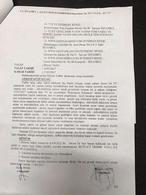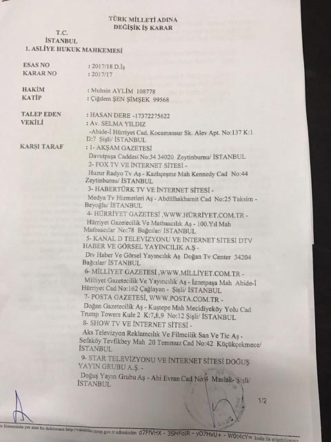 Söz konusu yayın yasağı, Dere'nin avukatı aracılığı ile duyuruldu.