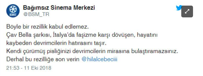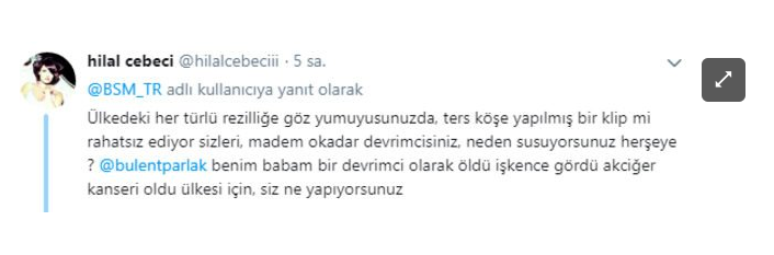 BSM'nin bu tepkisine ise Hilal Cebeci yanıt verdi. Cebeci sosyal medya hesabından, “Ülkedeki her türlü rezilliğe göz yumuyusunuzda, ters köşe yapılmış bir klip mi rahatsız ediyor sizleri, madem o kadar devrimcisiniz, neden susuyorsunuz her şeye? Bülent Parlak benim babam bir devrimci olarak öldü işkence gördü akciğer kanseri oldu ülkesi için, siz ne yapıyorsunuz” dedi.