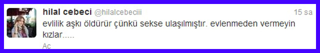 Uzun süredir hayranlarıyla bir şey paylaşmayan Hilal Cebeci, son açıklamalarında artık panpişliği bıraktığını açıklamıştı. Ancak güzel şarkıcı rahat durmadı. Cebeci, evlilik ve aşk üzerine ilginç bir yorumda bulunarak genç kızlara; "Evlilik aşkı öldürür çünkü sekse ulaşılmıştır. Evlenmeden vermeyin kızlar" tavsiyesinde bulundu.
