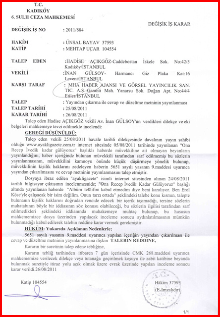 İşin ilginç yanı şikayet dilekçesindeki ifadeler, aslında Hadise'yi zor durumda bıraktı. Şöyle ki; Hadise dava dilekçesinde şu ifadelere yer verdi; 'Ben Erol Köse'yle çalışacak bir isim değilim. Onun tarzı ortada' Bu ifadeleri değerlendiren Hakim Ünsal Bayav, karar metninde şu ifadeleri kullandı; Talebe konu olan kısmın, talepte bulunanın kişilik haklarına doğrudan rencide edecek bir içerik taşımadığı, tersine sözlerin muhatabının böyle bir iddiasının söz konusu olabileceği, bu sözlerin ilgilisi tarafından sarf edilmedikleri şeklindeki iddianın da, mahkemeye muhtaç bulunup, bu hususun mahkememizce dosya üzerinden yapılacak inceleme konusu aydınlatılmasının mümkün bulunmadığı kabul edilerek, talebin REDDİNE karar vermek gerekmiştir.