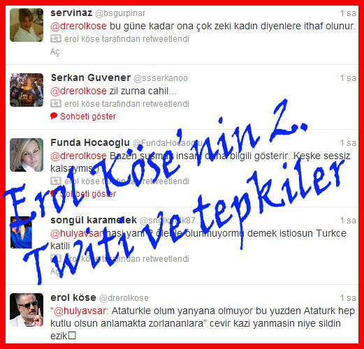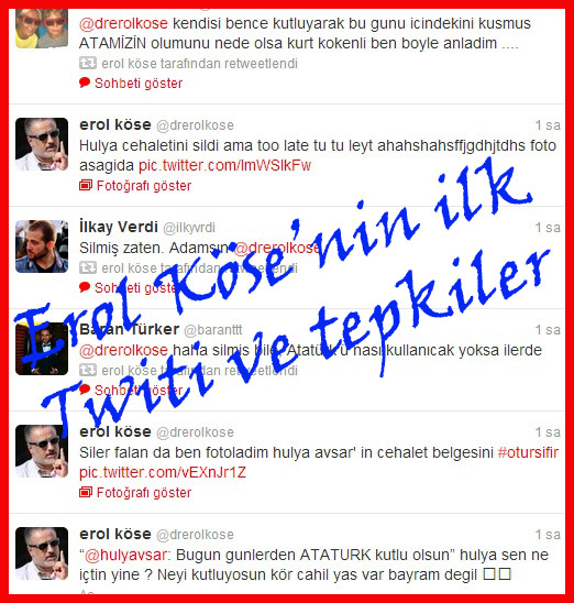 Twitter'ı kullanma sayısı günde 1-2 ile sınırlı olan Hülya Avşar; 10 kasım sabahı attığı twitte "Bugün günlerden ATATÜRK. Kutlu olsun"! yazınca ve bu twit erol Köse'ye ulaşınca olanlar oldu ve Avşar kızına tepki yapmağa başladı?