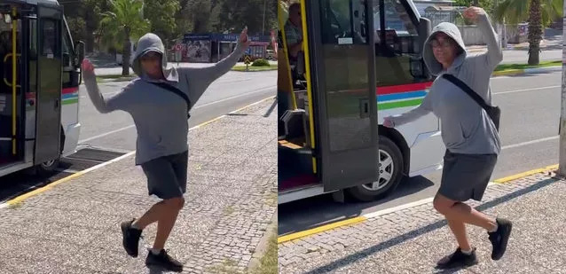 Hülya Avşar, Ayvalık'ta devam eden tatili esnasında toplu taşıma minibüsünden çalan Ankara havası eşliğinde kaldırımda oynadı.