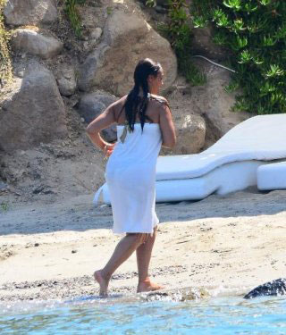 Tatiline Türkbükü'nde devam eden Hülya Avşar, mayolu görüntülenmemek için denize havluyla girdi.