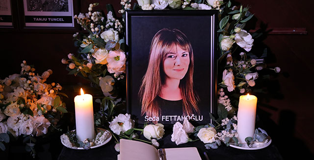 İBB Şehir Tiyatrosu geleneği üzere, Seda Fettahoğlu’nun ebedî yolculuğunu temsilen yaktığımız mumu; rol arkadaşı Özge Kırdı, kaidenin üzerindeki yerine yerleştirdi.
