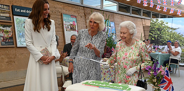 Gülüşmelere sahne olan etkinlikte Kraliçe, daha sonra bıçak ile pastayı kesti.