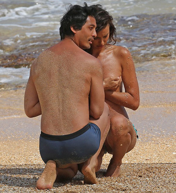Real Madrid'in Portekizli yıldızı Cristiano Ronaldo ile birlikte olan ünlü Rus model İrina Shayk üstsüz bir şekilde vücudu kumlarla kaplı bir halde Hawaii sahillerinde elleri ile göğüslerini kapatarak birbirinden cesur pozlar verdi.
