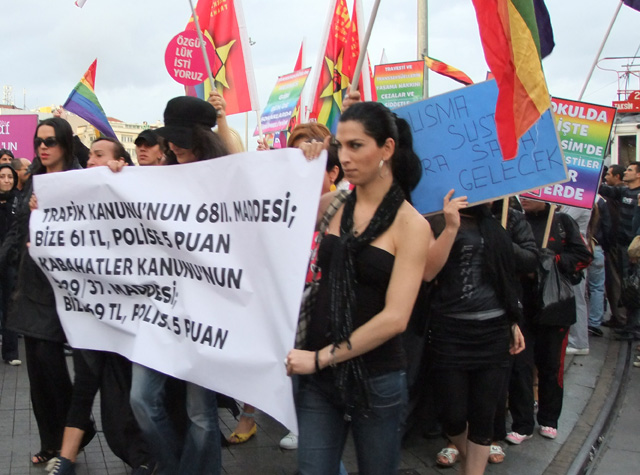 Özellikle Beyoğlu'ndaki turistlerin büyük ilgisini çeken travestilerin açtığı pankartlar ''Travesti ve transeksüel olmak kabahat değildir.Polis cezalarınla bizi yıldıramazsın'' şeklinde oldu?