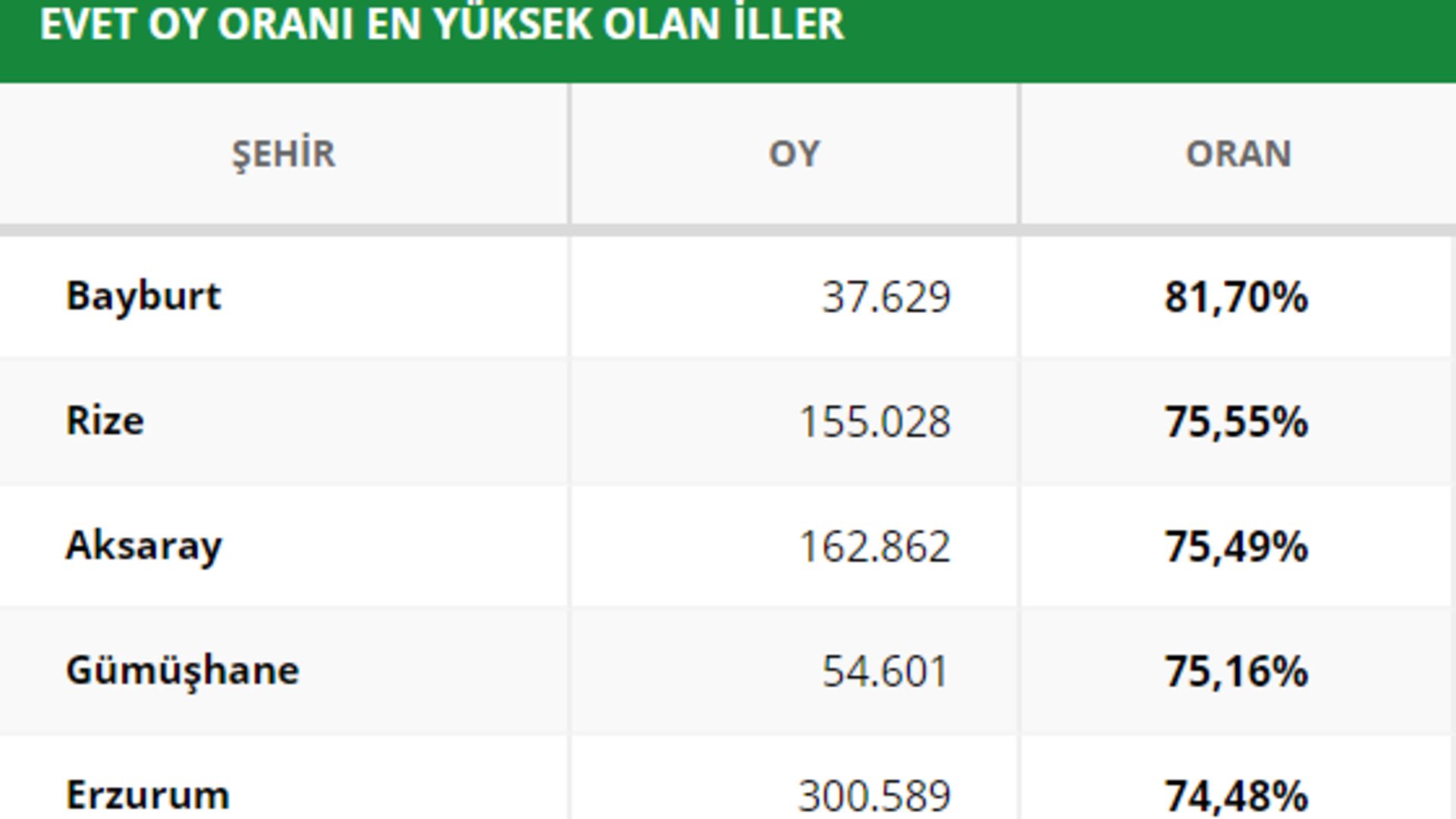 Referanduma katılım oranı yüzde 86,5 olurken sandıkların yaklaşık yüzde 99,8'i açıldı. Türkiye genelinde 48 ilde 'Evet', 33 ilde 'Hayır' oyları öndeyken, 30 büyükşehirin 13'ünde 'Evet', 17'sinde 'Hayır' önde. Hayır oy oranının en yüksek olduğu il yüzde 80,41 ile Tunceli. Evet oy oranının en yüksek olduğu il ise yüzde 81,70 ile Bayburt. 'Hayır'ın önde olduğu bölgeler Marmara, Ege ve Akdeniz bölgesi olurken, 3 büyükşehirden İstanbul, İzmir ve Ankara'da 'Hayır' oyları önde çıktı.