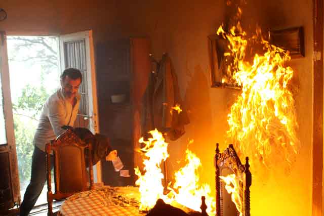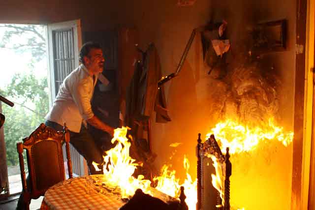 Yangın sahnelerini kazasız belasız atlattıklarını, ancak itfaiye ve güvenlik görevlilerini canlandıran yardımcı oyuncuların kendisini zorla tuttukları sahnelerde hafif bir sakatlık yaşadığını da sözlerine ekleyen ünlü oyuncu "Yedi arkadaş birden eve girmemi engellemek için üstüme atlayınca küçük bir sakatlanma oldu" dedi.