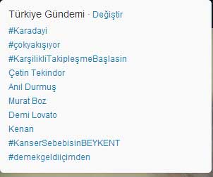 #Karadayi etiketinin yanı sıra dizi oyuncuları Çetin Tekindor ve Kenan İmirzalıoğlu da TT'ye girmeyi ve uzun süre gündemin üst sıralarında kalmayı başardılar. Bir süreliğine "Kenan" başlığı da TT'ye girmeyi başardı.