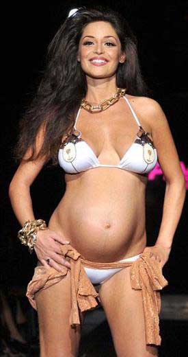 Altı aylık hamile olan Fico yüksek topuklu ayakkabılarının üstünde salına salına yürüyerek tanıtım yüzlerinden biri olduğu firmanın bikinilerini sergiledi.