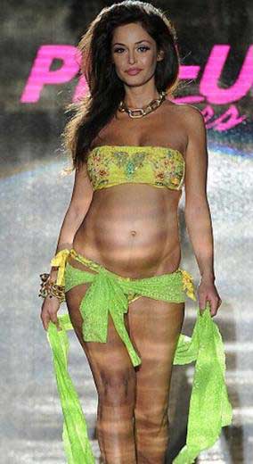 KARNI BURNUNDAYKEN BİKİNİ DEFİLESİNE ÇIKTI