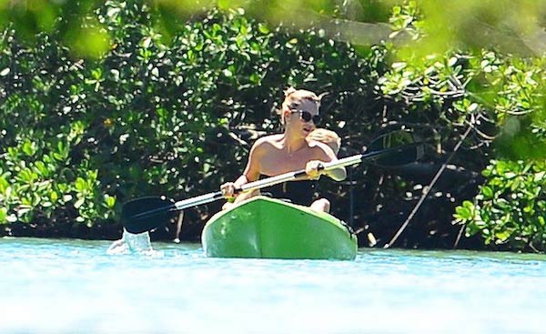 Jamaika'da üstsüz güneşlendiği plajda paparazzilere yakalanan 39 yaşındaki top model, formunu korumak için Atlantik Okyanusu'nda kürek sallamayı da ihmal etmedi.
