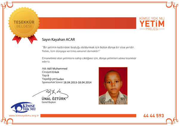 Ünlü sanatçı Kayahan, Kimse Yok Mu Derneği'nin Kutlu Doğum Haftası dolayısıyla başlattığı yetim kampanyası çerçevesinde, 9 yaşındaki Sudanlı Adil Muhammed isimli çocuğa sahip çıktı. Anne ve babasını kaybeden Adil?in eğitim, hastane ve barınma masraflarını bir yıl boyunca Acar ailesi karşılayacak.