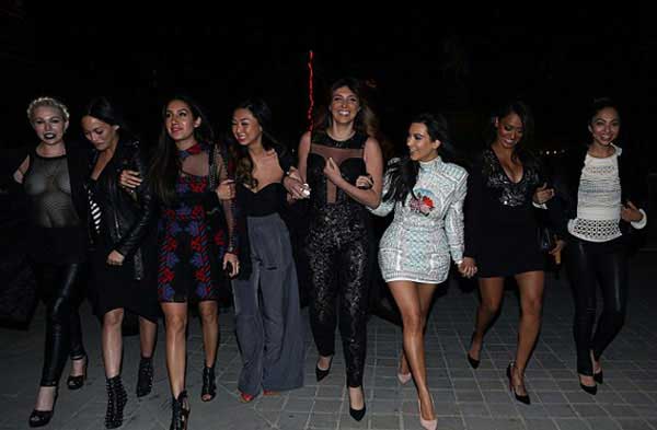 Sosyetik güzel Kim Kardashian çiçek desenli taşlı ve pullu desenleri mini elbisesi ile beğeni toplarken Kardashianların düzenlenen bekarlığa veda partisi için 15 şişe şampanya sipariş ettikleri ve tükettikleri iddia edildi.