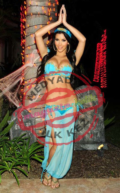 Güzelliği kadar seksiliğiyle de dikkat çeken esmer Ermeni güzelini mavi dansöz kıyafetleriyle görenler önce şaşırdılar sonra da göbek atan showgirlü tempo tutarak alkışladılar? Kardashian kendini ''Alladdin'in lambasındaki' 'Yasemin' benzetirken gazeteciler Kim Kardashian'ın resimlerini çekerken ''ilk kez giyinik görüyoruz '' diye şaka yaptılar ve hep birlikte kahkaha attılar?.