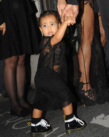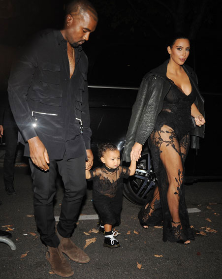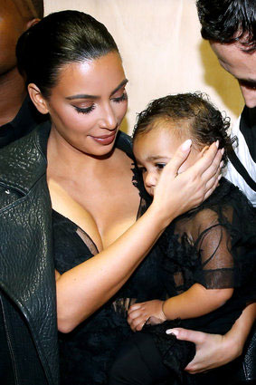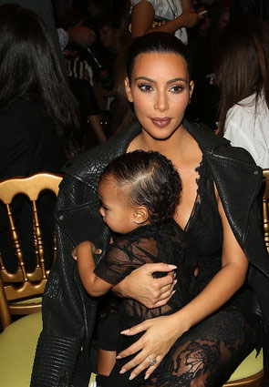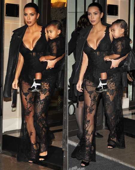 Kim Kardashian Paris Moda Haftası kapsamında gerçekleşen Givenchy defilesinde siyah dantelden cüretkar bir tulum giydi ve 1 buçuk yaşındaki bebeğini de kendisine benzer şekilde giydirdi.