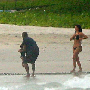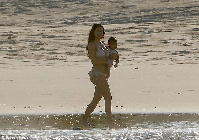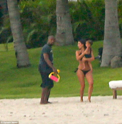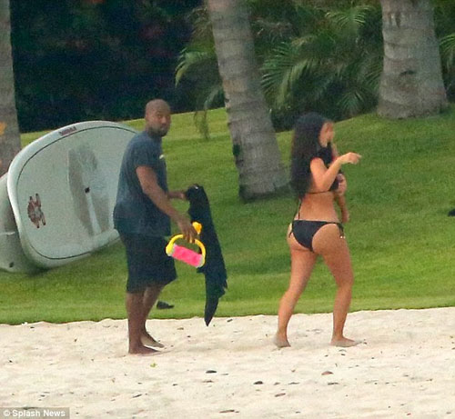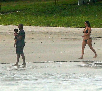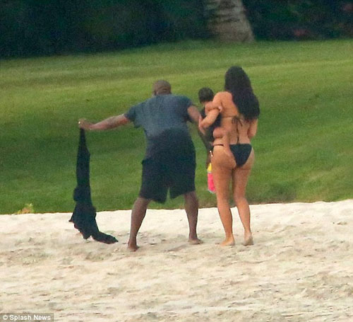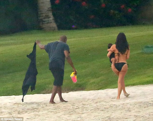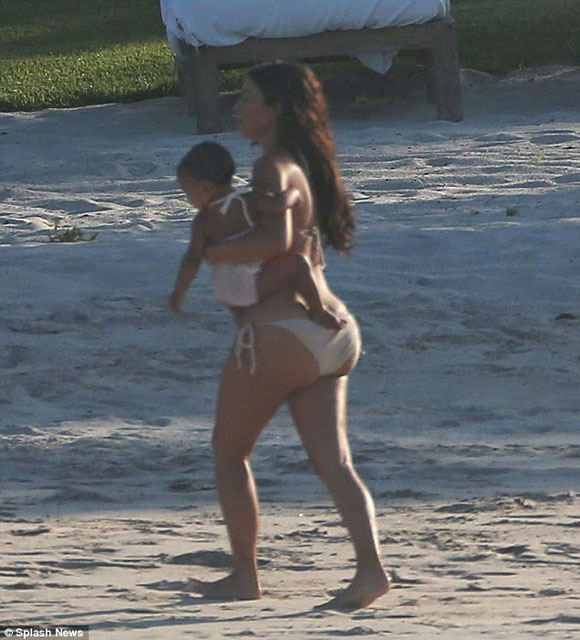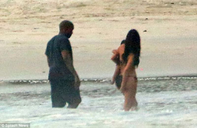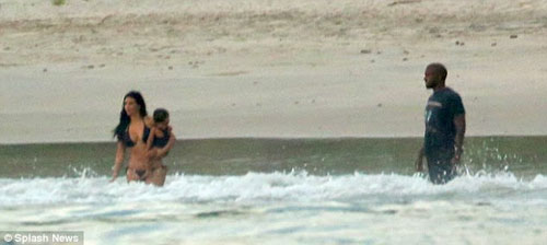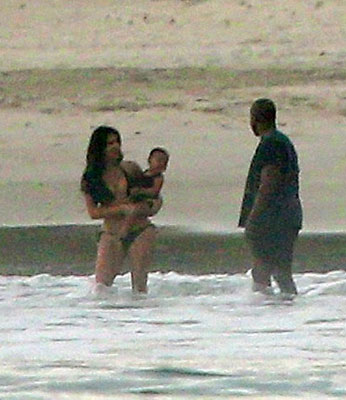 Kim Kardashian, denize de soktuğu minik North'u kucağından indirmedi. Bir ara minik North babasının kucağında kumsal gezintisi yaptı.