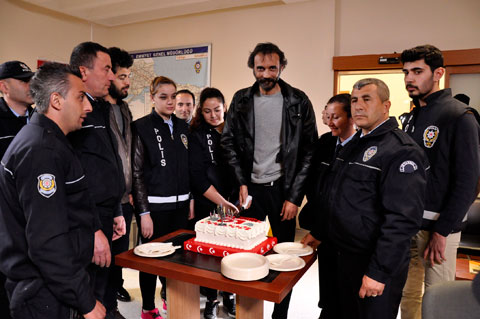 Arif Komiser, ona şaşkın bakarken, bir başka polis arkadaşı üzerinde ‘Polis Haftası Kutlu Olsun’ yazılı bir pasta ve alkışlar eşliğinde içeri girip, sürpriz yapıyor.