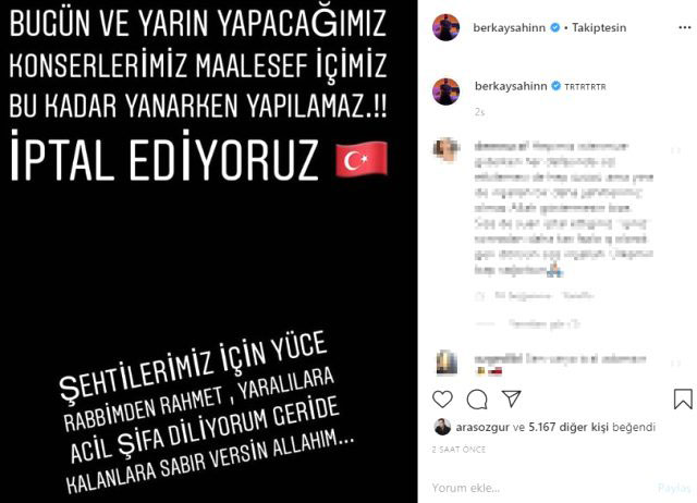 Acı haberi aldıktan sonra konser veremeyeceğini söyleyen şarkıcı Berkay Şahin, "Bugün ve yarın yapacağımız konserlerimiz maalesef içimiz bu kadar yanarken yapılamaz, iptal ediyoruz.