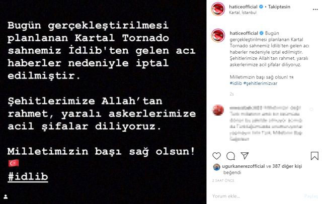 Berkay, Hatice ve Emel Sayın sosyal medya hesabından paylaşım yaparak İdlib'de 33 askerimizin şehit edilmesinin ardından konserlerini iptal etti.