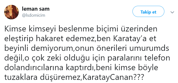 Sam, kişisel Twitter hesabından, "Kimse kimseyi beslenme biçimi üzerinden eleştirip hakaret edemez, ben Karatay’a et beyinli demiyorum, onun önerileri umurumda değil, o çok zeki olduğu için paralarını telefon dolandırıcılarına kaptırdı, beni kimse böyle tuzaklara düşüremez, Karatay Canan???" diye yazdı.