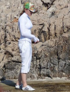 Denize boğazlı beyaz bir bluz ve beyaz capri pantolonla girmeyi tercih eden Madonna, başına da güneşten korunmak veya kendini daha da kamufle etmek için kasket takmış.