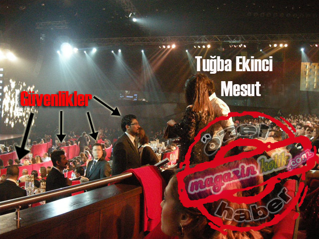 Belli ki güvenlik Tuğba Ekinci için özel olarak bilgilendirilmişti? Ne de olsa Ekinci geçtiğimiz yıl Beyazıt Öztürk, Ayşe Arman'la birlikte sahnede ödülünü almakta olan Tarkan'ın sahnesine çıkmasıyla büyük bir kriz yaşatmış ve salonda buz gibi bir hava estirmişti?