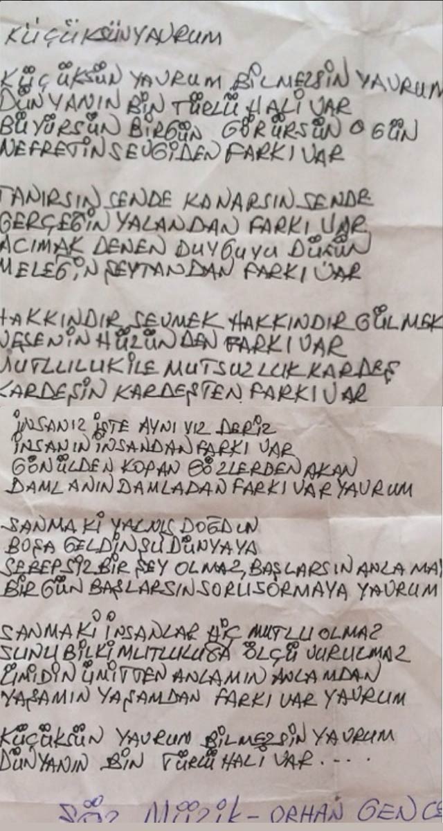 Sosyal medyada yer almayan usta sanatçı Orhan Gencebay, "Küçüksün Yavrum" isimli şiirini, hayat arkadaşı Sevim Emre aracılığı ile İnstagram da paylaştı ve bu anlamlı şiiri Berkin Elvan`a ithaf etti...