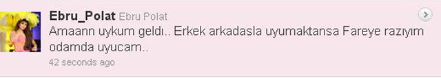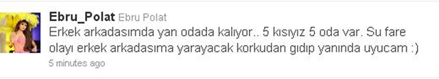 Ebru Polat, herhalde sevgilisinin odasında hemen uyamayacağını (!) düşünüp, "Amaann uykum geldı.. Erkek arkadasla uyumaktansa Fareye razıyım odamda uyucam.." twitiyle bundan vazgeçtiğini açıkladı?