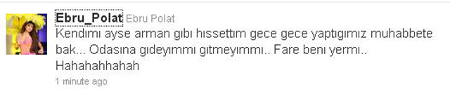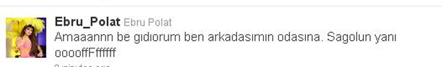 "Amaaannn be ! gıdıorum ben arkadasımın odasına. Sagolun yanı ooooffFffffff" sözükleriyle geceyi nasıl geçirecek konulu merakımızı da giderdi Ebru Polat? Ne diyelim onlar ermiş muradına, biz çıkalım kerevetine?