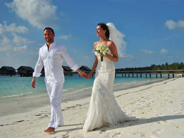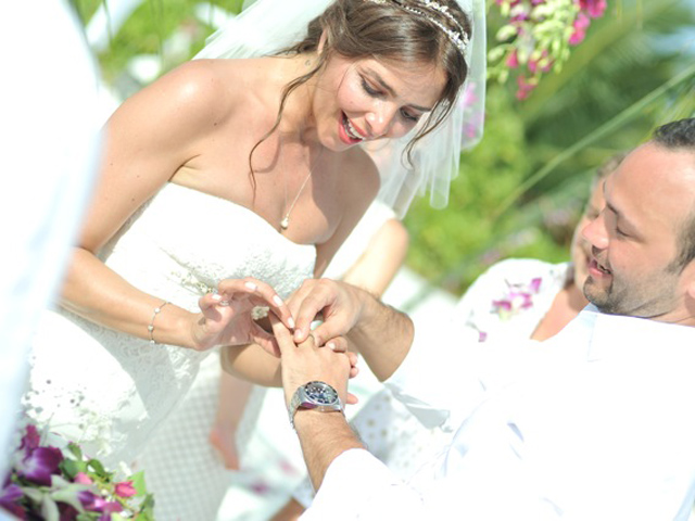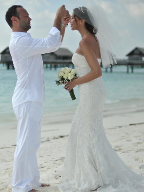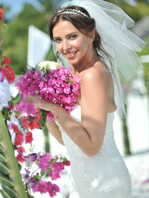 Çift; inci renkli kumlar, fuşya renkli orkidelerden oluşan çiçeklerin ve çıplak ayaklarının üstünde birbirlerine "evet" dediler.