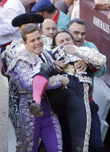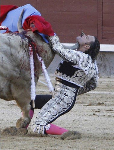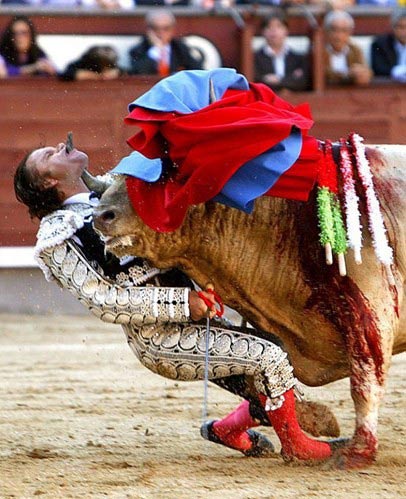 Madrid'te yapılan boğa güreşinde matadorun bir anlık gafletinden yararlanan boğanın boynuzu boğazından girdi ağzından çıktı...--->FOTOĞRAFLAR için TIKLAYUNUZ!...
