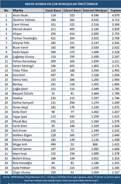 Rapora göre, internet medyasında en çok konuşulan isimler Acun Ilıcalı ve İbrahim Tatlıses olurken, yazılı basında ise Seda Sayan, Esra Erol ve Müge Anlı öne çıkan isimler oldular.