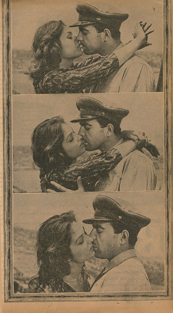 1961 yapımı 'Otobüs Yolcuları' adlı filmden alınan fotoğraflarda Türkan Şoray ile Ayhan Işık'ın öpüştüğü görülüyor.