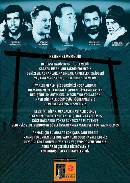 Antalyalı gazeteci yazar Mehmet Kesim tarafından uzun süredir titizlikle hazırlanıp 29 Mayıs?ta İlgi Kültür Yayınevi?ne bağlı Avrupa Yakası Yayınevi?nden çıkacak ve Türkiye?nin saygın kitapevleri raflarında yerini alacak olan ?Müsaadenizle? adlı şiir kitabında yer alan 'Neden Sevemedik? şiirinde Deniz Gezmiş, Adnan Menderes, Nazım Hikmet, Ahmet Kaya ve Said Nursi aynı duygu ve düşünceler içerisinde şiirde yer alırken, şiirin yazarı Mehmet Kesim şiirinde toplumun her kesiminin duygu ve düşüncelerini dile getirdi.