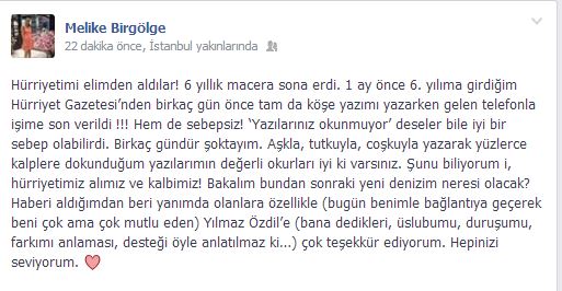 Hürriyet gazetesinin başarılı yazarı Melike Birgölge işten çıkarılmanın şaşkınlığını yaşıyor....Birgölge işten çıkarılmasını ve durum karşısındaki duygularını Facebook'taki hesabından sevenleri ile paylaştı işte o duygu dolu yazı....