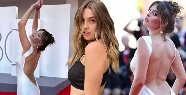 Bir markanın davetlisi olarak Venedik Film Festivali'ne katılan oyuncu Melis Sezen, kuyruk sokumuna kadar uzanan dekolteli beyaz bir elbise giydi.