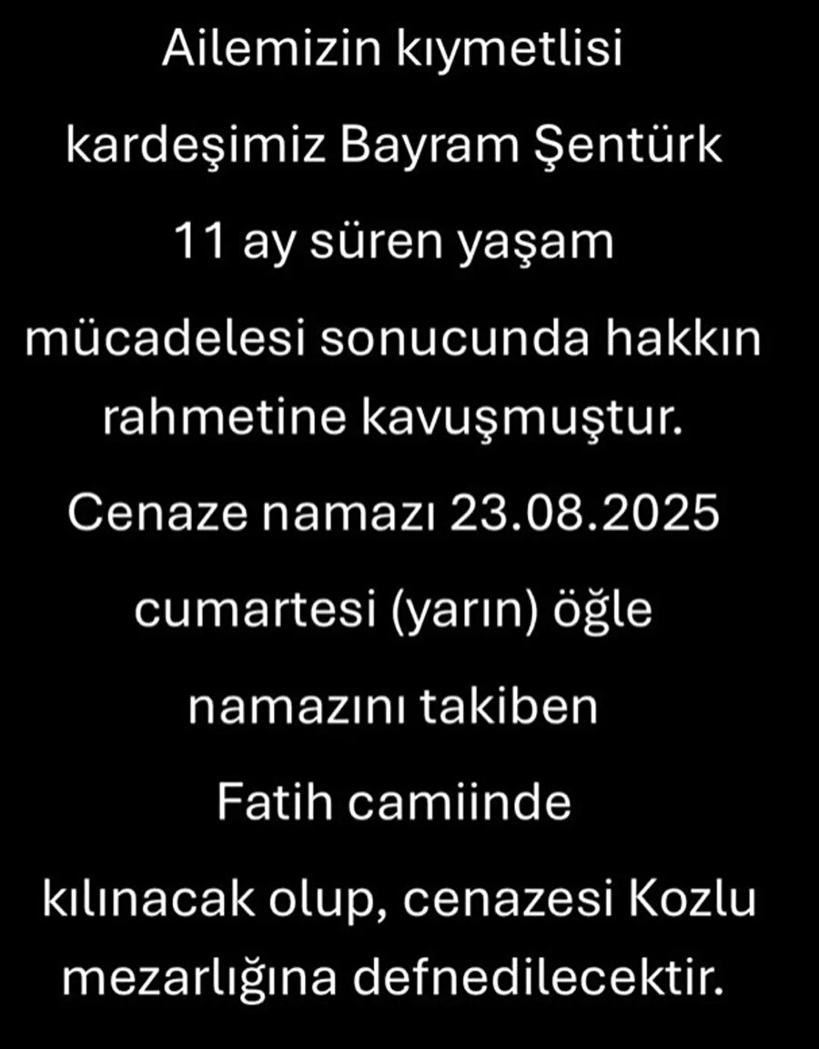 Ancak bugün paylaştığı mesajda üzücü haberi verdi. Metin Şentürk, “Ailemizin kıymetlisi kardeşimiz Bayram Şentürk 11 ay süren yaşam mücadelesi sonucunda Hakk’ın rahmetine kavuşmuştur.” ifadeleriyle kardeşinin vefatını duyurdu.