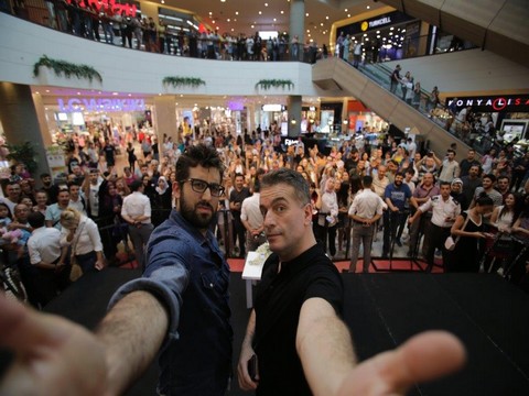Sevgi seli ile karşılanan oyuncular kendilerini dinlemeye gelen ziyaretçilerle tek tek selfie çektirdi.