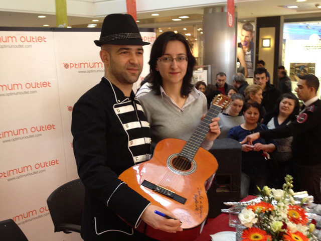 Murat Evgin' in imza gününe katılan bir hayranı; Evgin' e, yanında getirdiği gitarını imzalattı.