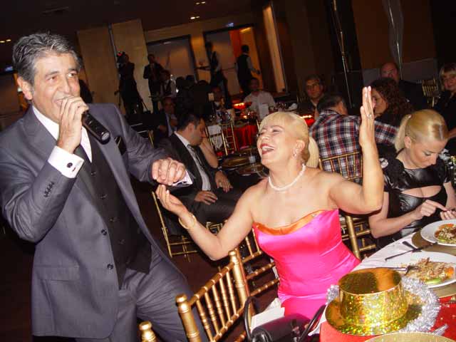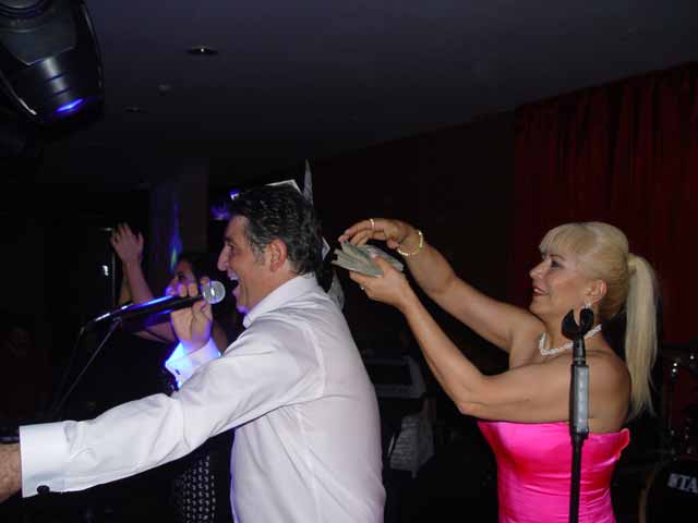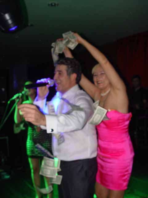 Tekstil işine giren pop müziği sanatçısı Murat Göğebakan, saat 24.00 de sahnede şarkı söylerken,ortağı Ürkan Miras tarafından dolar yağmuruna tutuldu.