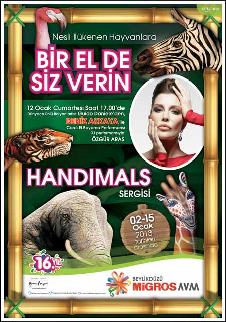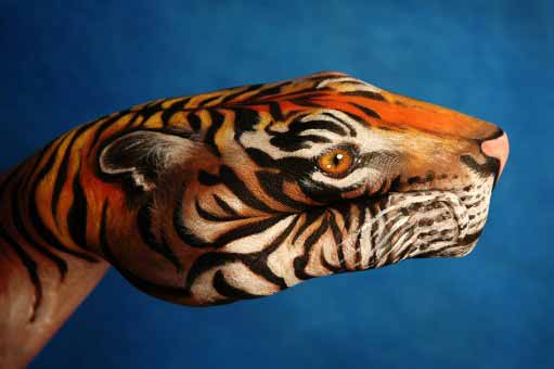 Sergide yer alan tablodan çıkmış gibi görünen fotoğraflar, aslında hayvan şeklinde boyanan eller. Yılandan, Zürafaya, Kartaldan Aslan'a kadar birçok hayvanı, insan ellerini tuval gibi kullanarak ince ince işleyen sanatçının resimlerinden etkilenmemek mümkün değil.