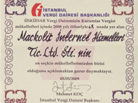 İstanbul Vergi Dairesi Başkanı Mehmet Koç'un imzalayıp gönderdiği belgede Üsküdar Vergi Dairesine bağlı 28.838 şirket arasında en çok kurumlar vergisi ödeyen 49. şirket olarak yer aldık.