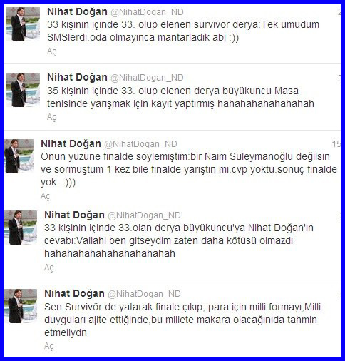 Derya Büyükuncu'nun elenmesinin ardından, Nihat Doğan, twitter sayfasından milli yüzücü ile dalga geçti. Nihat Doğan, Survivor finalinde yarıştığı ve SMS oylarıyla kaybettiği Büyükuncu'yu milli formayı duygu sömürüsü aracı yapmakla suçlamıştı.