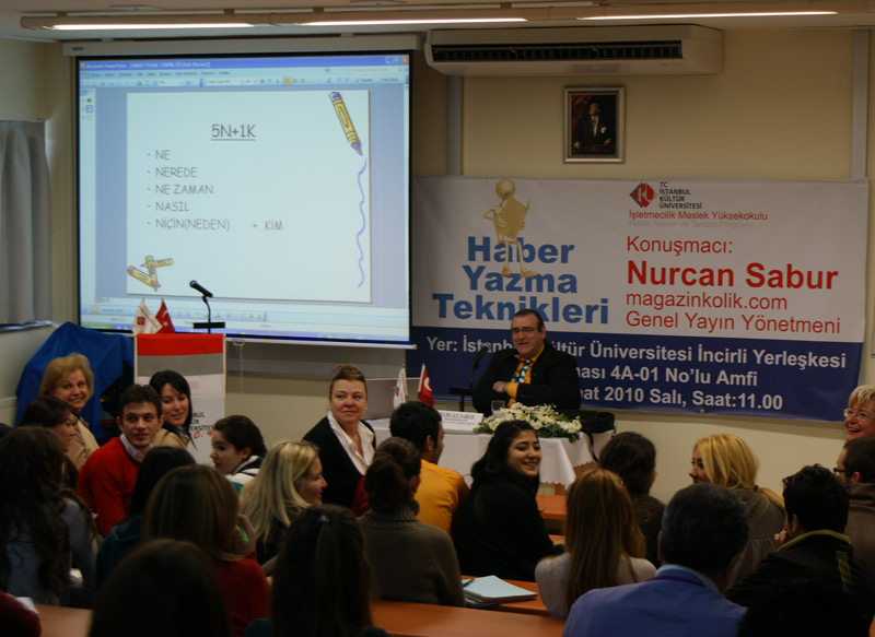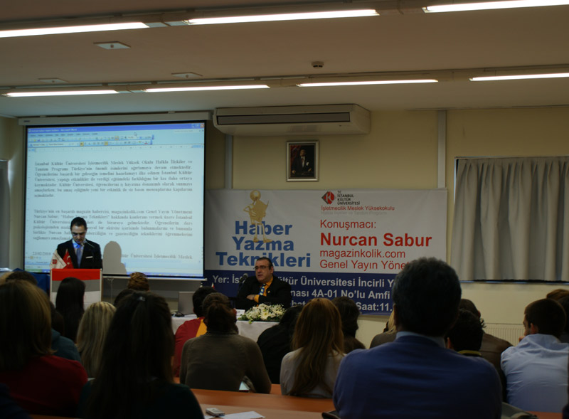 Türkiye'nin başarılı magazin habercilerinden, magazinkolik.com Genel Yayın Yönetmeni Nurcan Sabur "Haber Yazma Teknikleri" hakkında konferans vermek üzere İstanbul Kültür Üniversitesi öğrencileri ile bir araya geldi.