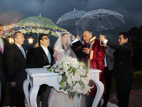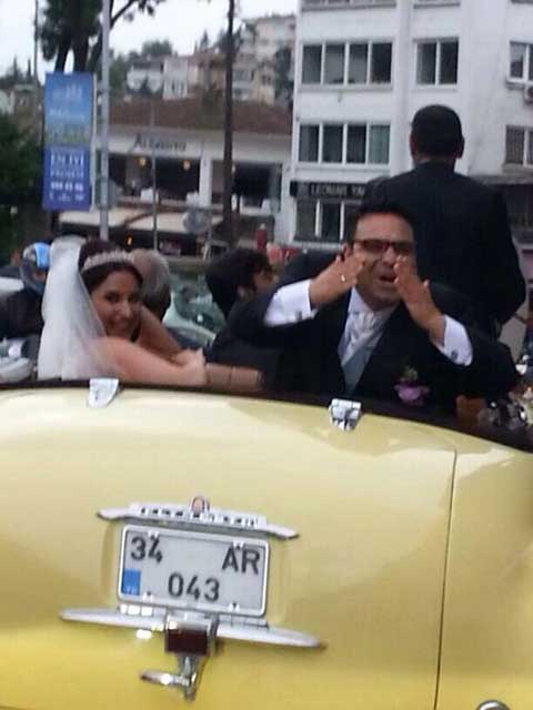 Düğünün yapıldığı mekana, Büyük Tarabya Oteli'nden antika gelin arabasıyla, gelin alma konvoyu ile gelen çifti sağnak yağmur bile duruduramadı.