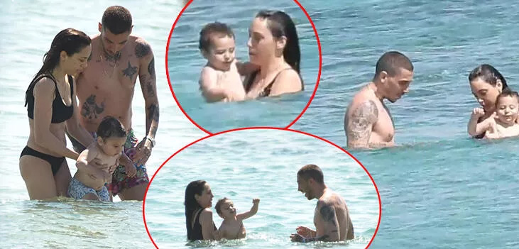 Ünlü çift önceki gün özel bir plajda görüntülendi. Karayel ve Bonomo öğle sıcağından bunalan minik oğlunu denize sokarak serinletti.
