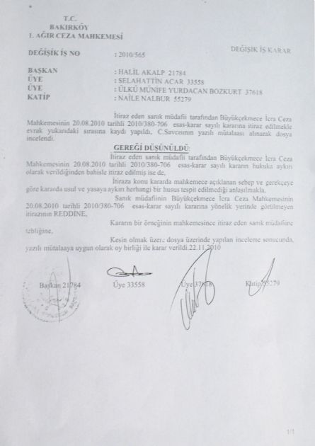 Büyükçekmece İcra Ceza Mahkemesi Dosya No: 2010/380 Karar no: 2010/706 20/08/2010 Tarihli Gerekçeli Karara İtiraz eden B.Ozan ORHON un İtirazına da Bakırköy 1.Ağır Ceza Mahkemesi Değişik İş NO: 2010/565 Değişik İş Kararında REDDİNE, Karar vererek Ozan ORHON'un cezası kesinleşti. İnfaz Savcılığına giden dosya sonrası gözler B.Ozan ORHON'a çevrildi. Borcunu Ödemezse 1 Ay Tazyik Hapis Cezası ile Cezalandırılmasına karar verilen B.Ozan ORHON bu karar karşısında ne yapacağı merakla bekleniyor.