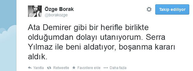 Başarılı oyuncunun eşi Ata Demirer ve Serra Yılmaz Twitter hesaplarından Özge Borak'ın hesabının ele geçirildiğini duyurdu.